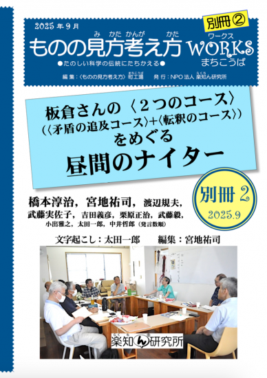 2024 年8月5日(月)に,名古屋のころりんハウスに 10 人が集 まりました。『ものの見方考え方 WORKS 1』に載った宮地祐司「本には書かれなかった板倉さんの 〈最も根源的な発想法〉」をめぐって,自由闊達に駄弁る会をやりました。題して「昼間のナイター」です。