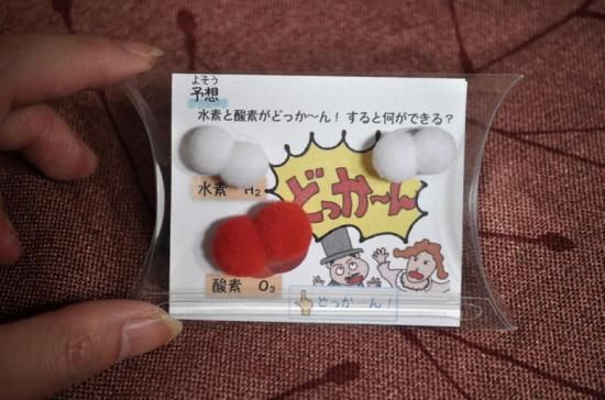 できあがったプラスチックケースの端をたたくと・・・「どっか〜ん」と音がして,酸素分子と水素分子が反応し,一瞬にして水分子が誕生するたのしいカードです。